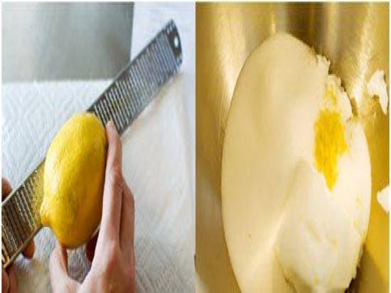 - 3. Dùng dụng cụ bào lớp vỏ chanh bên ngoài và cho vào cùng luôn nhé. Chanh sẽ tạo mùi thơm đặc trưng cho bánh đấy.