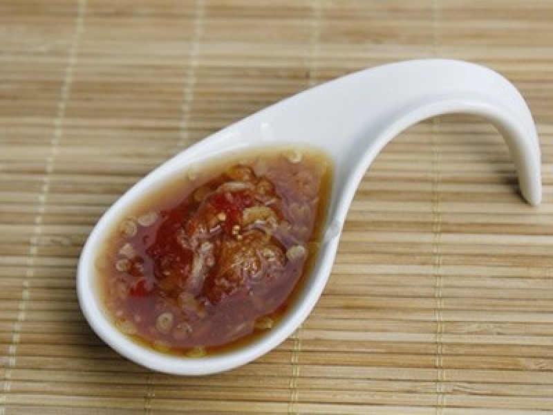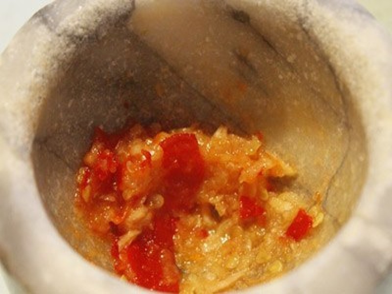 • 4. Tỏi, ớt quả giã nhuyễn, đường hòa tan với nước mắm, sau đó cho tỏi ớt đã giã nhuyễn vào, định lượng tùy theo khẩu vị của bạn.