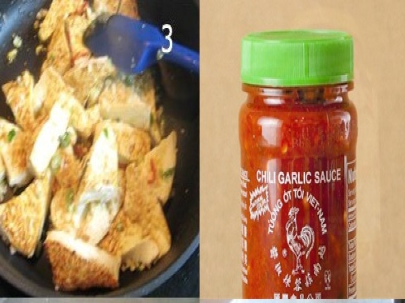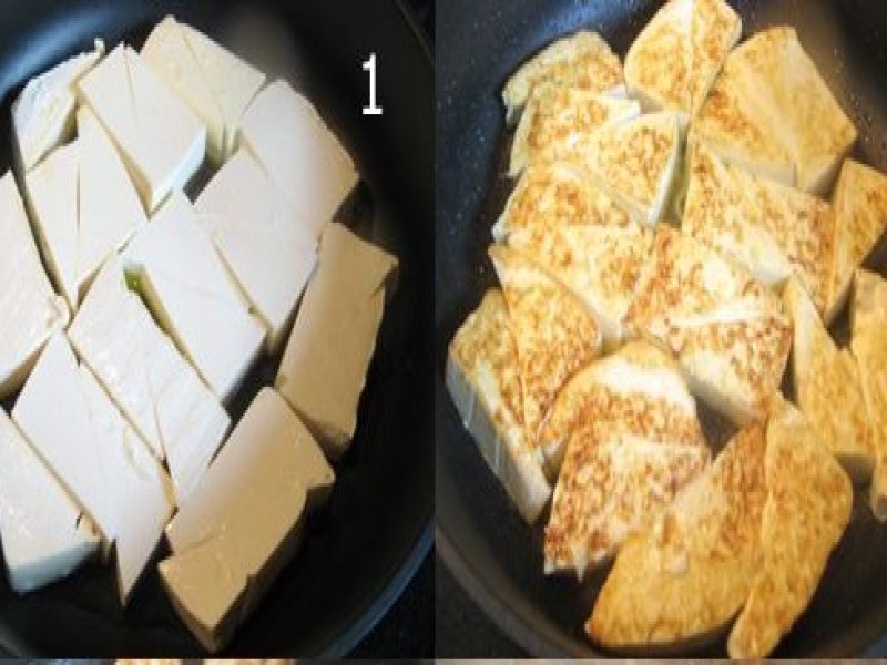 • 2. Cắt đậu phụ thành miếng hình chữ nhật rồi cắt đôi. Làm nóng chảo với 1 muỗng canh dầu chiên rồi chiên vàng cả hai mặt miếng đậu.