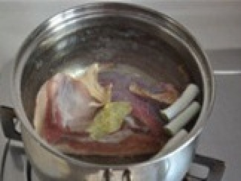 • 3. Đun sôi nồi nước có thả vài lát gừng tươi, đầu hành trắng và củ hành tím đập giập, thêm chút xíu rượu nấu rồi thả thịt vào luộc. Thịt chín, vớt ra thái miếng mỏng, dài chừng 5 – 6 cm.